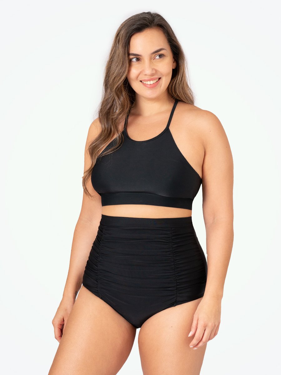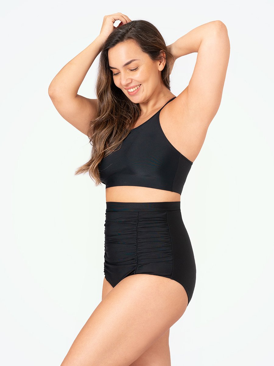 Light-tummy control and ruching means that you can comfortably rock your bikini and feel confident by the water. Say, “buh-bye” to unflattering bikinis and “hello” to a full coverage style that smooths and looks great on all shapes and sizes.