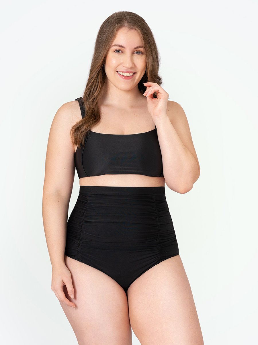 Light-tummy control and ruching means that you can comfortably rock your bikini and feel confident by the water. Say, “buh-bye” to unflattering bikinis and “hello” to a full coverage style that smooths and looks great on all shapes and sizes.